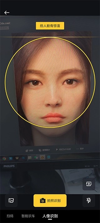 3、此时请把人脸对准黄色方框,点击那个【圆点】按钮进行拍照,稍等几秒钟就能看到结果了。