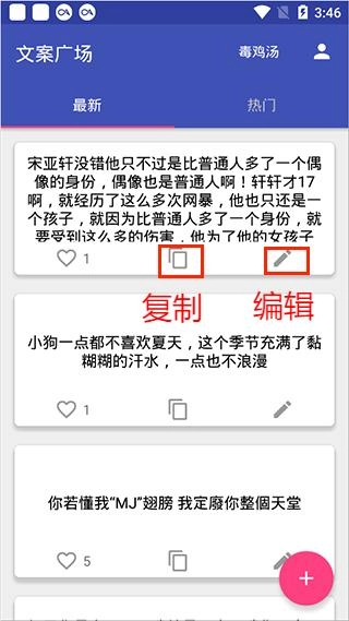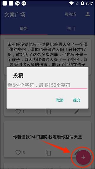 4、点击下方的加号选项,用户就能进行文案投稿,把自己喜欢的文案或是心中原创的优美句子分享出来,供大家欣赏。