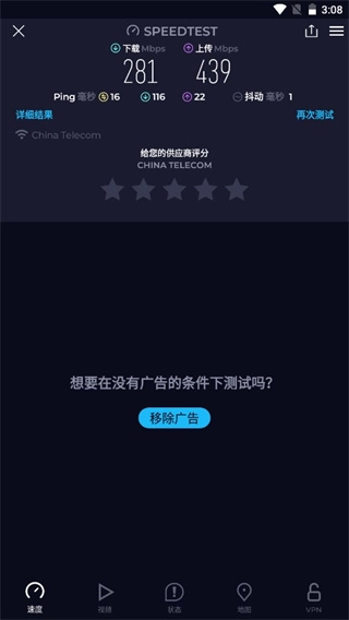speedtest能让你体验简单的30秒内一键连接测试,因为我们的全球网络确保在任何地点测速都精准可靠。你可以浏览依据这款应用收集的真实数据绘制的移动网络覆盖地图,还能在应用内直接将众多移动运营商的网络可用性情况可视化呈现,甚至能细致到街道级别。