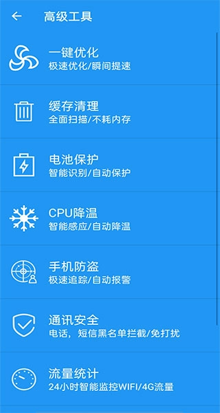 2、更多功能涵盖:一键优化、缓存清理、电池保护、CPU降温、手机防盗、通讯安全、流量统计、进程管理以及设置。