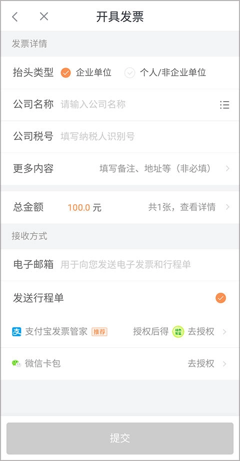 4、最后选定需要开发票的订单,准确填写【发票抬头】与【电子邮箱地址】,点击下方的提交按钮就可以了。