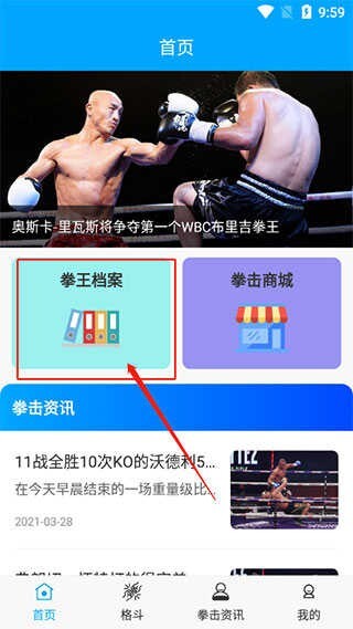 1、进入软件,在首页点击拳王档案