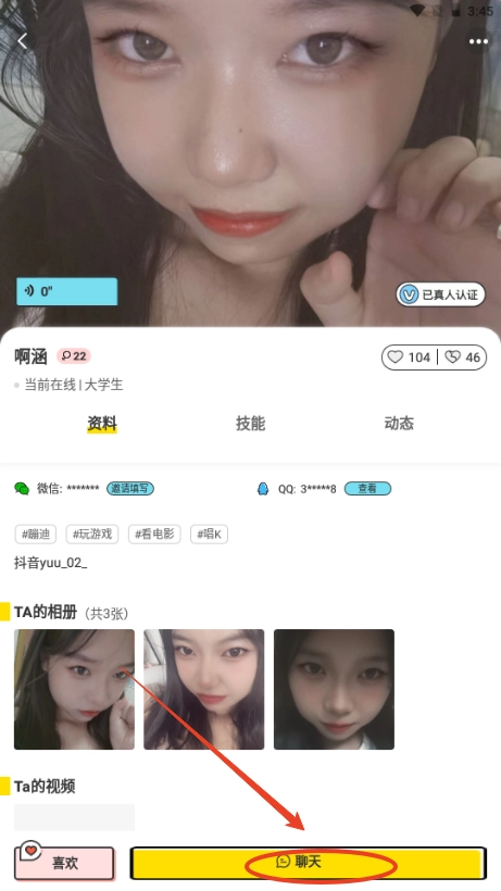 借助“在线约会”功能,能快速通过视频匹配到附近的TA,对方可以陪你约会、语音聊天,让聊天变得更丰富有趣,助你摆脱无聊时光。