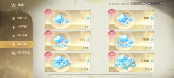 无限暖暖氪金获取的是无垠星石,就是蓝色的这个,老规矩,首充星石翻倍,除开双倍就是1:10兑换比例。