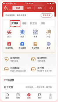 交易板块内原有的“沪深”子板块已升级为“沪深京”子板块,该板块支持上海证券交易所、深圳证券交易所、北京证券交易所及全国中小企业股份转让系统的交易功能,您可在此完成4个交易所的证券交易、持仓查询、交易记录查询等相关操作。