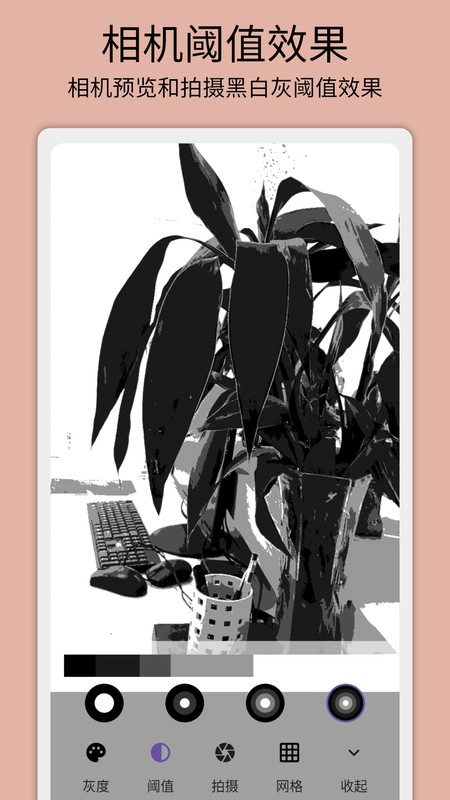 灰阈相机是一款面向艺术家、摄影师、设计师等艺术从业者的专业摄影软件,聚焦于灰度、阈值、网格等高级图像处理功能,致力于助力用户创作出具有艺术质感的黑白或单色摄影作品。
