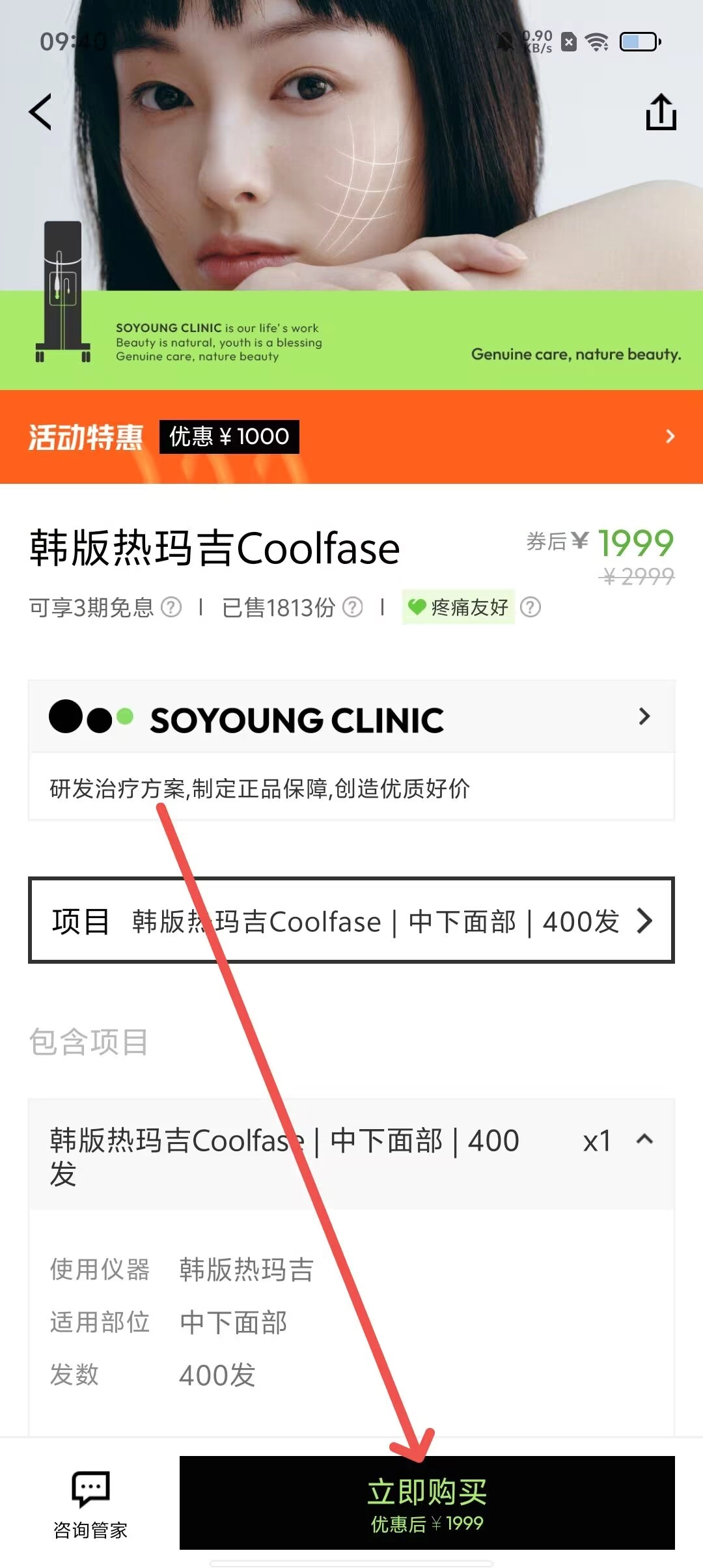 4.确认好想要选购的医美项目后,点击右下角的“立即购买”按钮,就能跳转到付款页面了。