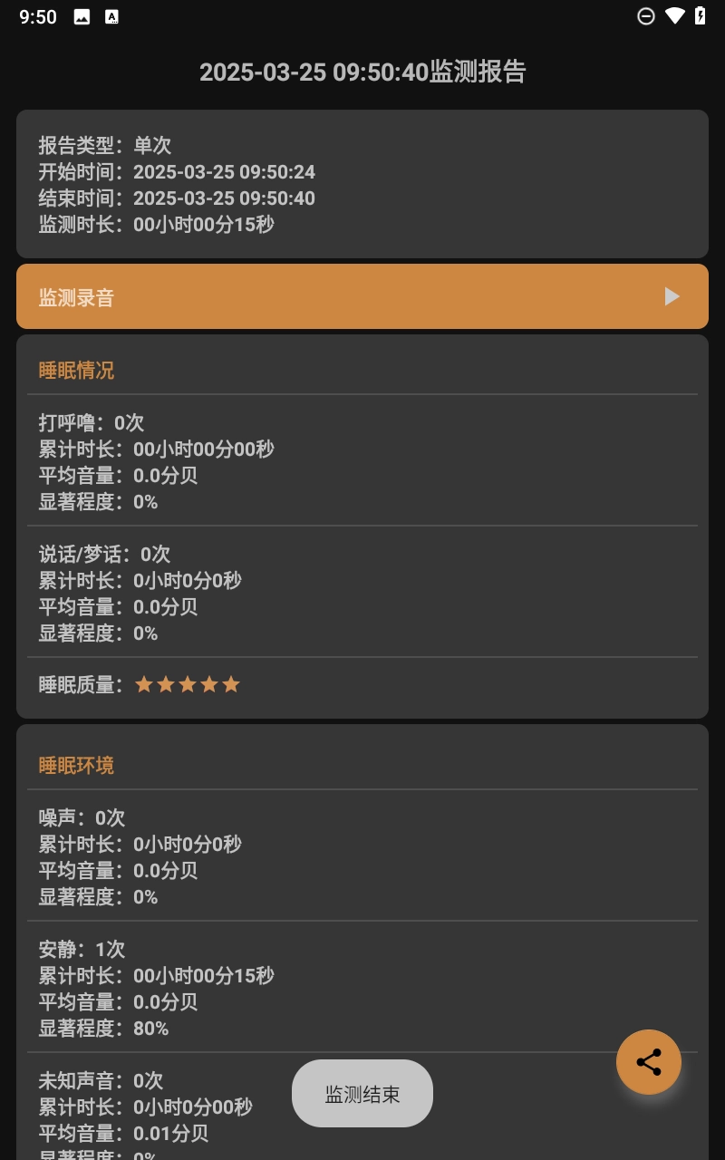 3.第二天,你就可以查看详细的睡眠质量报告,报告里涵盖了打呼噜的次数、时长、声音大小等指标,还包含睡眠环境噪音的评估结果,能帮助你全面了解自身的睡眠状况。