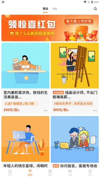 2、进入到精选,在这里有很多无需出门就可以工作的兼职,闲暇时期也可以赚钱。