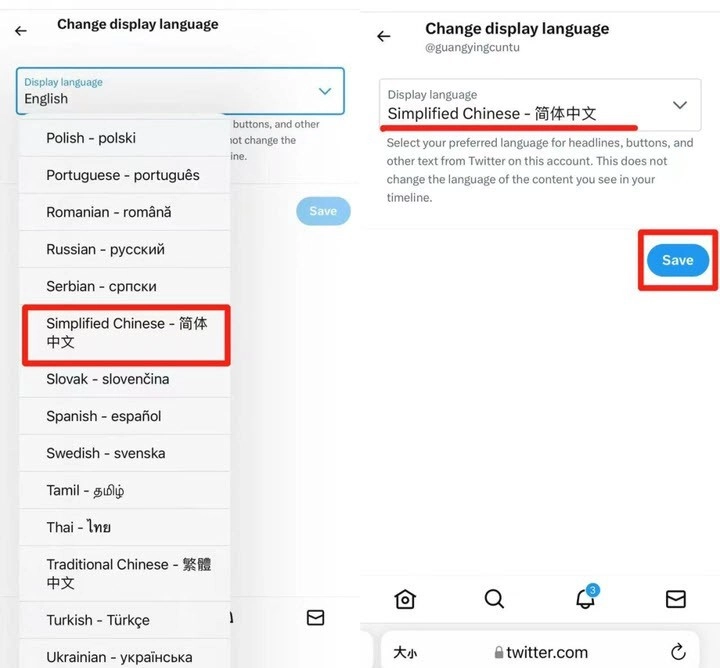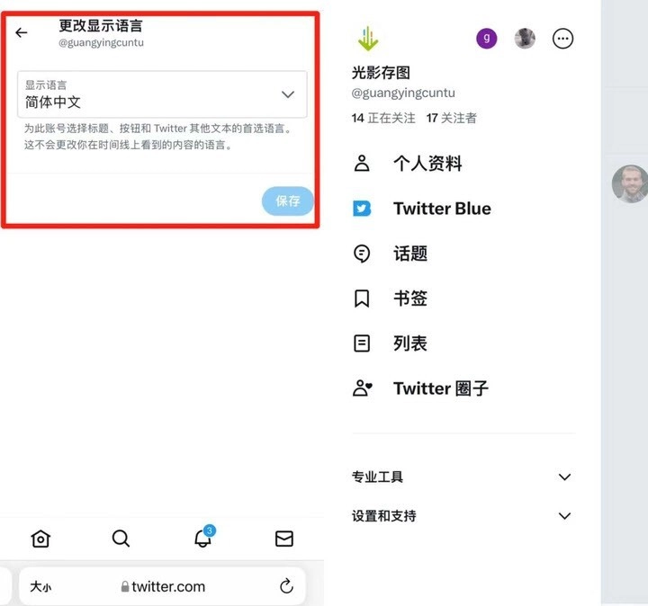 5、点击“Save”后,会看到该设置界面已切换为中文字体,此时重新打开twitter,就能发现它已设置成中文了!