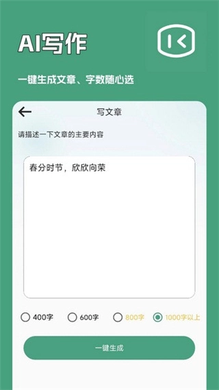 一键文章生成器是一款十分实用的智能文章生成工具,用户借助它能够迅速产出所需的各类内容,像情书、检讨书、广告词、工作总结、范文等都不在话下。它生成内容的速度很快,操作也简便易上手,全程没有广告干扰,既能帮我们节省时间,又能让我们体验到智能化技术带来的便捷与乐趣。