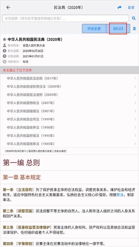 2、点击进入就能阅读,点击右上角的“历史变更”还能查看具体的变更年份和变更内容。
