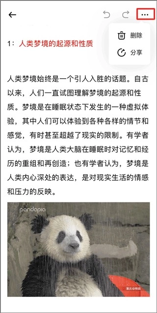 5、点击右上角图标,可以将文章删除或是分享给好友。