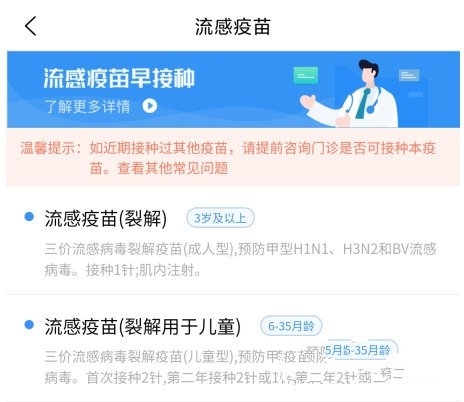 【新增】支持6月龄及以上人群接种的四价流感疫苗,以及四价流感亚单位疫苗的线上预约与报名排队服务。