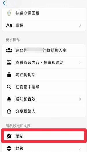 下拉,选择「限制」功能,确认限制对方。