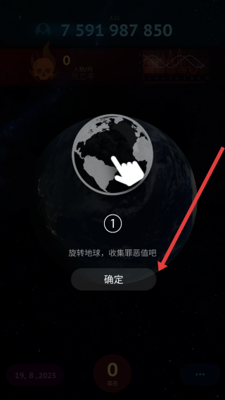 3、进入神秘场景后,通过点击确定按钮,按提示旋转地球模型,收集罪恶值,解锁后续游戏玩法与剧情。