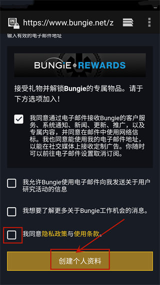 6、创建完成后在图示位置填入你的电子邮件地址并同意使用条款,点击创建个人资料