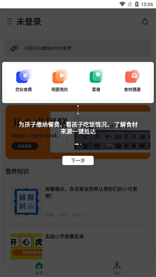 1、首页支持家长为孩子缴纳餐费,查看孩子的就餐情况、食材来源与每日菜谱,还能了解各类营养知识。