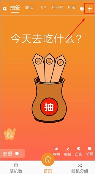 1、打开随机抽签抓阄,点击右上角【+】可添加选择问题;