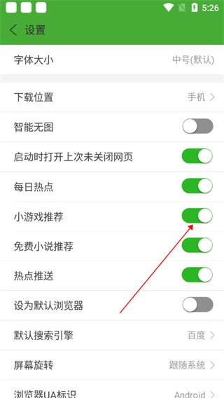 6、当“小游戏推荐”按钮呈现绿色时,问题便得以解决。