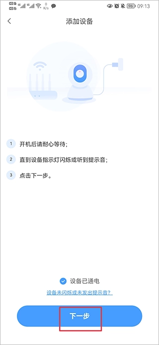 4、按照提示将设备通电后点击下一步
