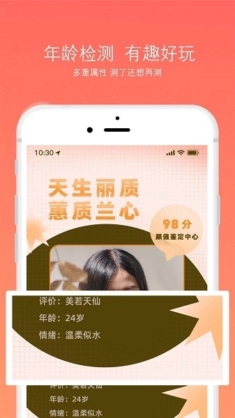 1、支持年龄测试,通过人脸照片,预测你此时的状态年龄;