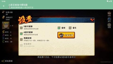 7、在设置里找到“忍者配置”选项,它能确保我们100%招募到选定的忍者碎片。