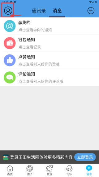 1、打开玉田生活网应用,点击底部消息选项,进入消息页面。