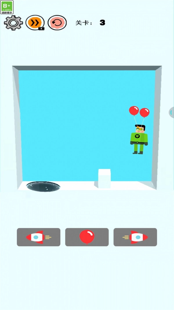 3、对道具进行合理搭配,例如先借助气球让火柴人飞越障碍,接着使用火箭对位置进行微调,从而使其精准落入坑中。