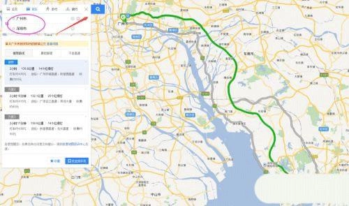 3、再在下面输入出发地点与到达地点就可以查询点于点之间的距离、收费和时间。
