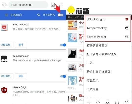 ps:虽然对扩展的支持还不错,但由于扩展都是基于桌面浏览器开发的,因此部分扩展即使安装好了,在手机上使用也可能存在问题,这个没办法。