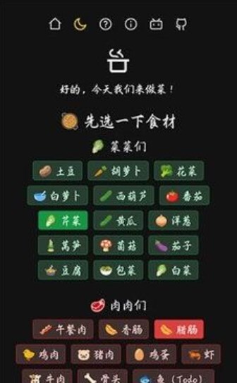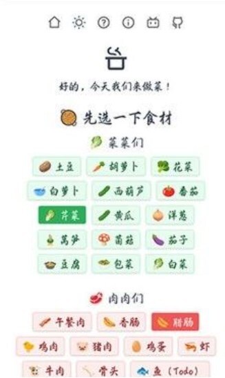 1、在爱东东进入隔离食用手册App时,第一步要依据自己现有的食材与厨具,挑选对应的关键字;