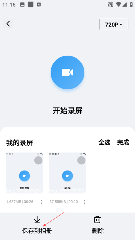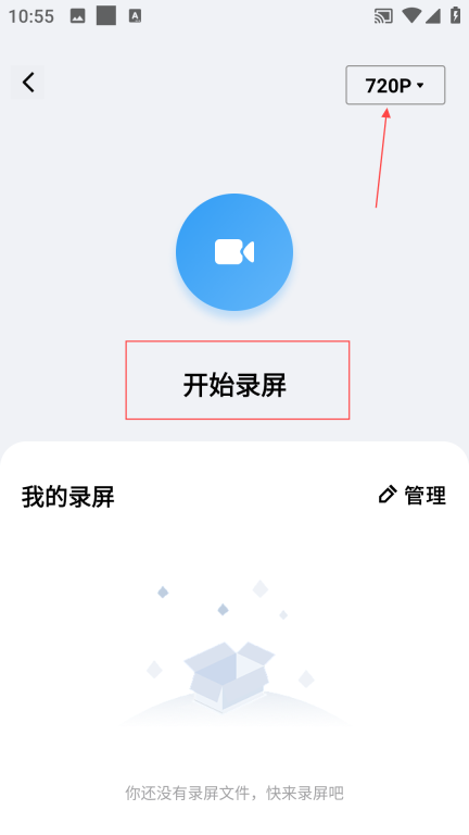 3、点击【开始录屏】,录屏结束后会自动保存,若要保存到相册,可点击【管理】按钮。