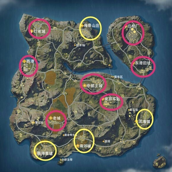 根据降飞机出发位置和飞行时间,尽早选择好自己的降落地点。不要一味的追求建筑物多的地方,建筑物越多,遇到的敌人可能性越大,吃鸡的几率就越小(当然,大神除外)。所以,本人根据某一地点降落人数的多少,总结出了下图: