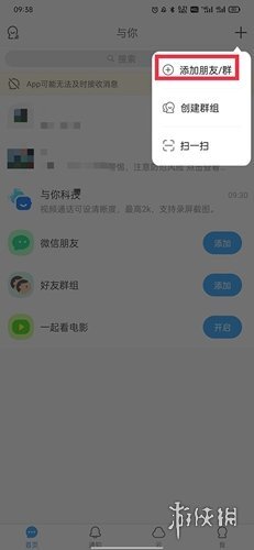 2. 在弹出的下拉菜单中,选择“添加朋友/群”选项。