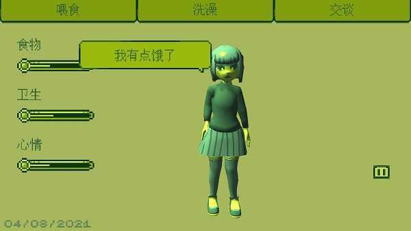 注意:女孩左侧呈现的食物、卫生、心情三类属性对应着各自的数值,需依据这些属性的具体情况来决定是喂食、洗澡,还是与她交谈!