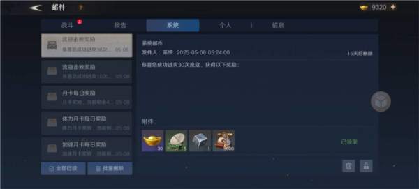 在城外攻打流寇,攻打到一定次数,邮件会自动发放奖励。