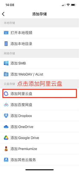 2、点击“添加”按钮后,再点击“添加存储”,会跳转到添加存储页面,这里以阿里云盘为例进行示范。