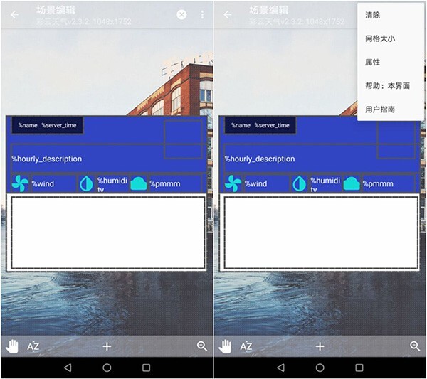 右下角的放大镜按钮可以用来切换场景的状态(1.设置场景相对于手机屏幕的布局,2.设置场景内的元素)