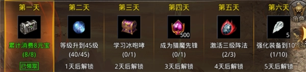 第一,第三天的各职业专属技能的学习可以通过第一天的首充来完成,正好首充完第三天可以免费领取一本本职业技能,基本上一个首充就解决了前三天的任务要求,第四天成为猎魔先锋是要购买三天的直购礼包才能领取到这个称号,直购礼包最便宜是六元礼包,可以购买三天的六元礼包获得该称号。不过这里建议对于小氪的友友们最好在七天后购买一次二十八元的法阵礼包,里面会附送一个卧龙镖令,可以完成第七天的押送高级镖车任务,其次购买的阵法之灵加上每日任务获得足以升级到三级阵法。最后一个第六天的强化任务其实算是最难的一个,这个十星强化任务比较看脸,因为强化非常的吃金币,所以单纯靠金币硬砸上去的十星就只能肝,当然要是舍得花点元宝,在强化到六星后可以通过元宝购买幸运石增加成功率来直升十星(只需要一个部位达到十星便可完成目标,而且只有一转以上的装备才能强化到十星)