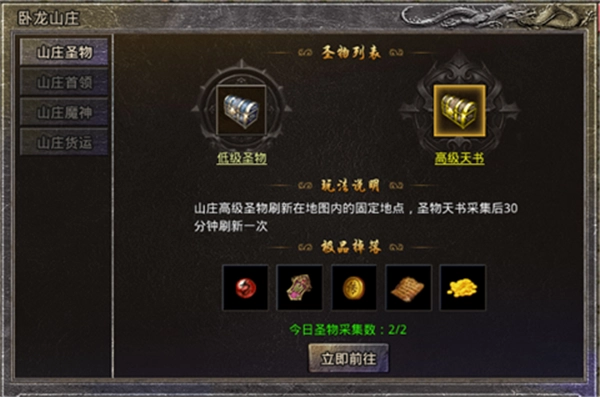 山庄圣物分为低级圣物和高级圣物: