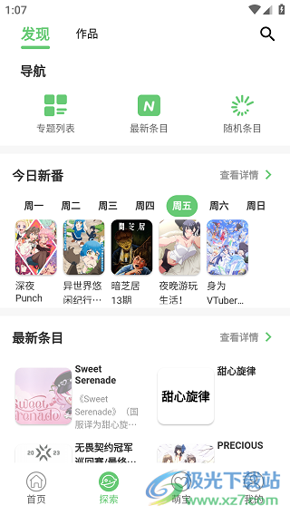 2、探索,发现和作品都可看,一键就可看新番,最新条目都展示。