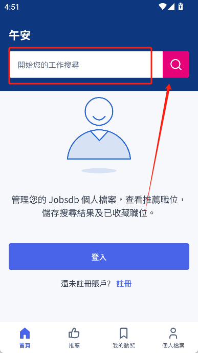 1、首先在魔趣网并安装jobsdb ,打开之后你可以选择“登录”账号,也可以直接“搜寻职位”