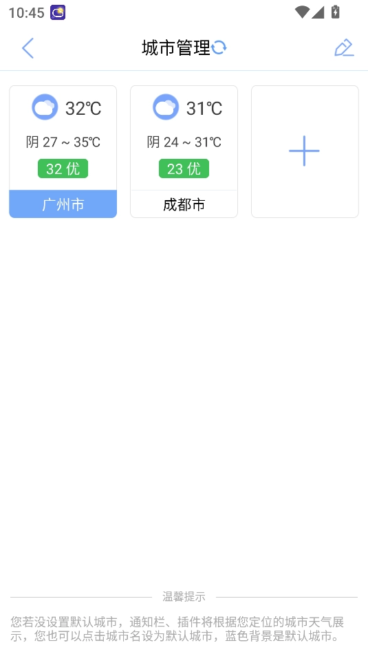 3、在主页点击左上角按钮进入城市管理界面,切换添加的城市