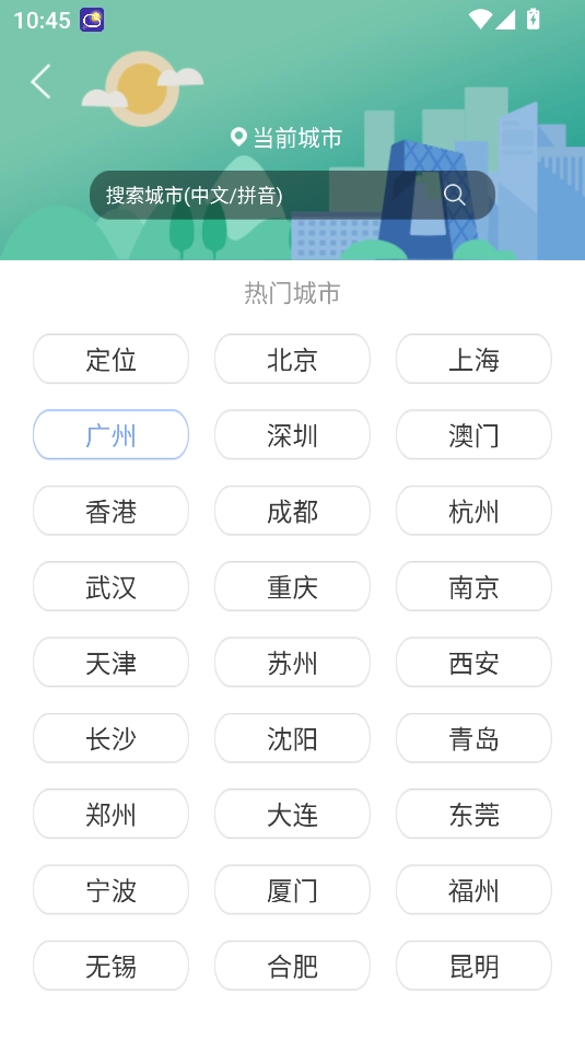 2、搜索城市名称,选择后添加