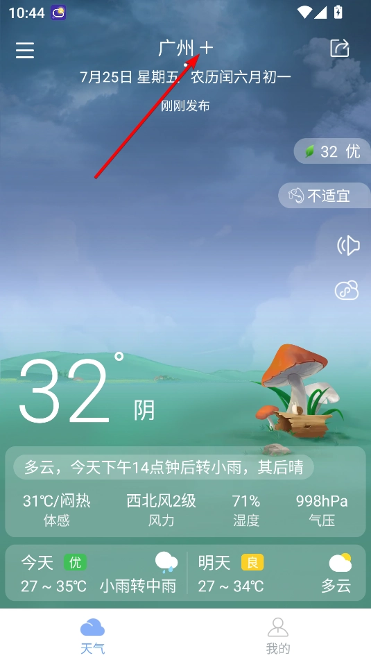 1、打开最准天气,点击上方的+