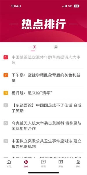 3. 在热点界面可以查看最新的热点排行情况,提供近一天和一周的排行展示。