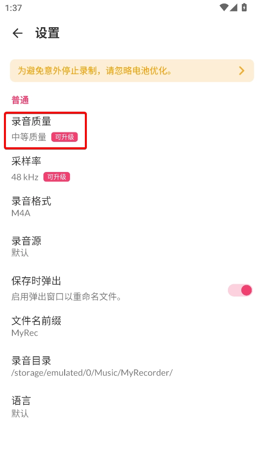 3、进入设置界面点击录音质量