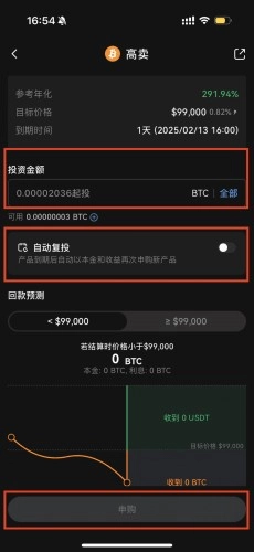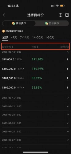 3、以“高卖BTC”为例,点击该选项后将进入“选择目标价”页面,您可通过“目标价格”“年化利率”“期限”这几个维度来挑选心仪的理财产品。