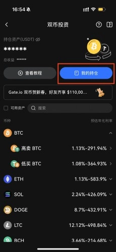 5、在“双币投资”页面点击【我的持币】查看购买的产品信息列表。